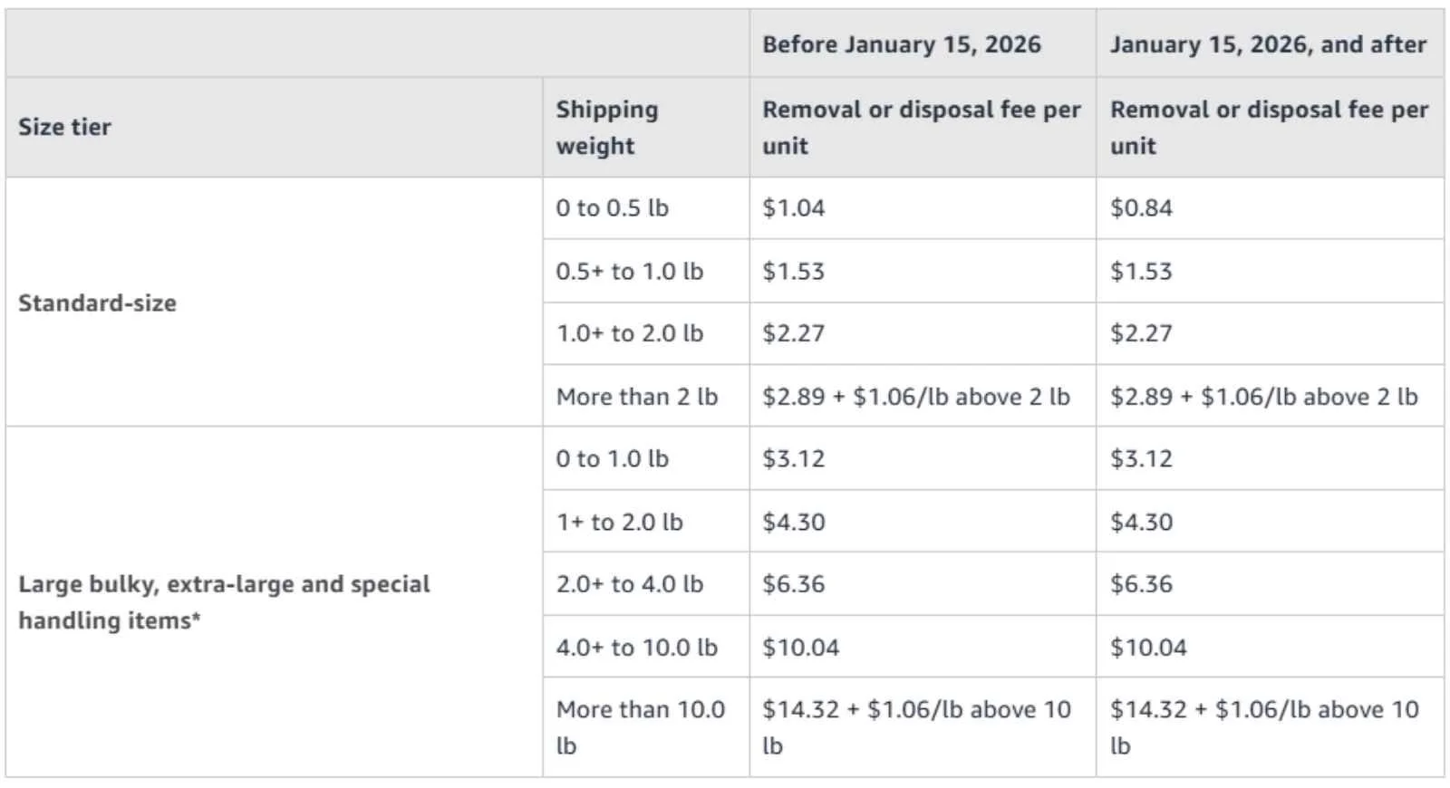 Removal and disposal fees for standard-size aged items weighing less than 0.5 lb will be reduced by $0.20 per unit. This change will encourage timely removal of excess inventory.