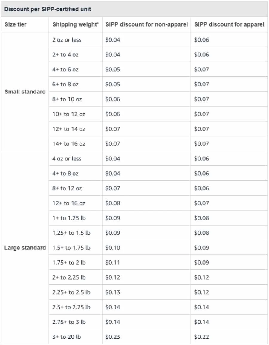 Amazon is continuing the Ships in Product Packaging (SIPP) cost savings program opportunity, which appears to be a rebranding of Amazon’s SIOC (Ships in Own Container) program, which is a part of Amazon Frustration-Free Packaging initiative. SKUs enrolled in the program are eligible to receive a discount on FBA fees, depending on SKU size and weight. Focusing on packaging improvements will reduce costs by ensuring products have a minimal viable amount of packaging materials that still have the appropriate strength level to reduce damage in transit on top of the cost savings discount incentive provided by Amazon. Depending on the product, sellers are able to self-test products and record results to enroll in the SIPP program. Here is an overview of the rate card for potential discount savings:
