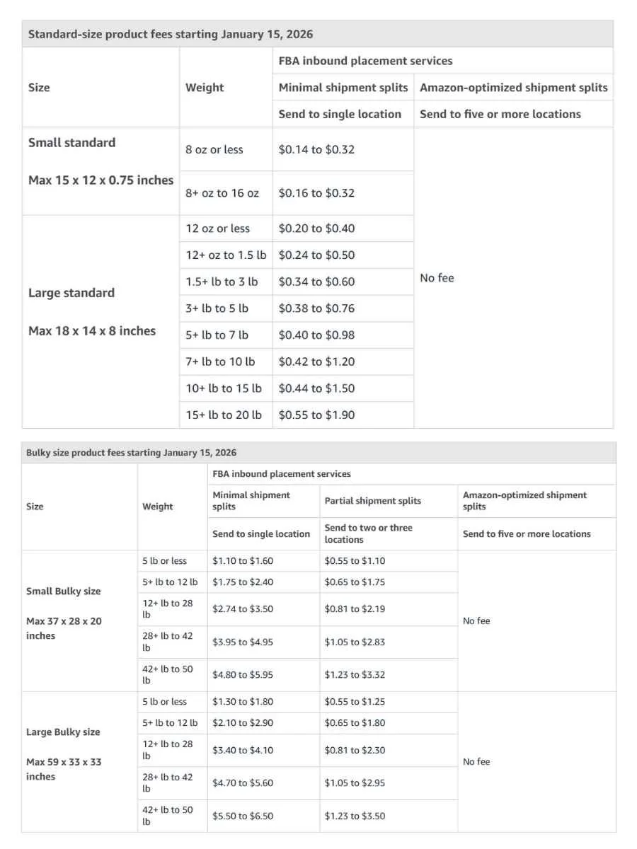 The biggest changes in Inbounding and Placement fees will be that Amazon will will increase the inbound placement service fee for standard size product by an average of $0.05 per unit and introduce two shipping weight bands for small standard and five shipping weight bands for large standard size products between 3 to 20lbs. The Large Bulky size tier will also be split into Small and Large Bulky size tiers and increase the minimal shipment split fees for the new Large Bulky size tier by an average of $0.27 per unit. Here is a breakdown of the Inbound and Placement fees for 2026: