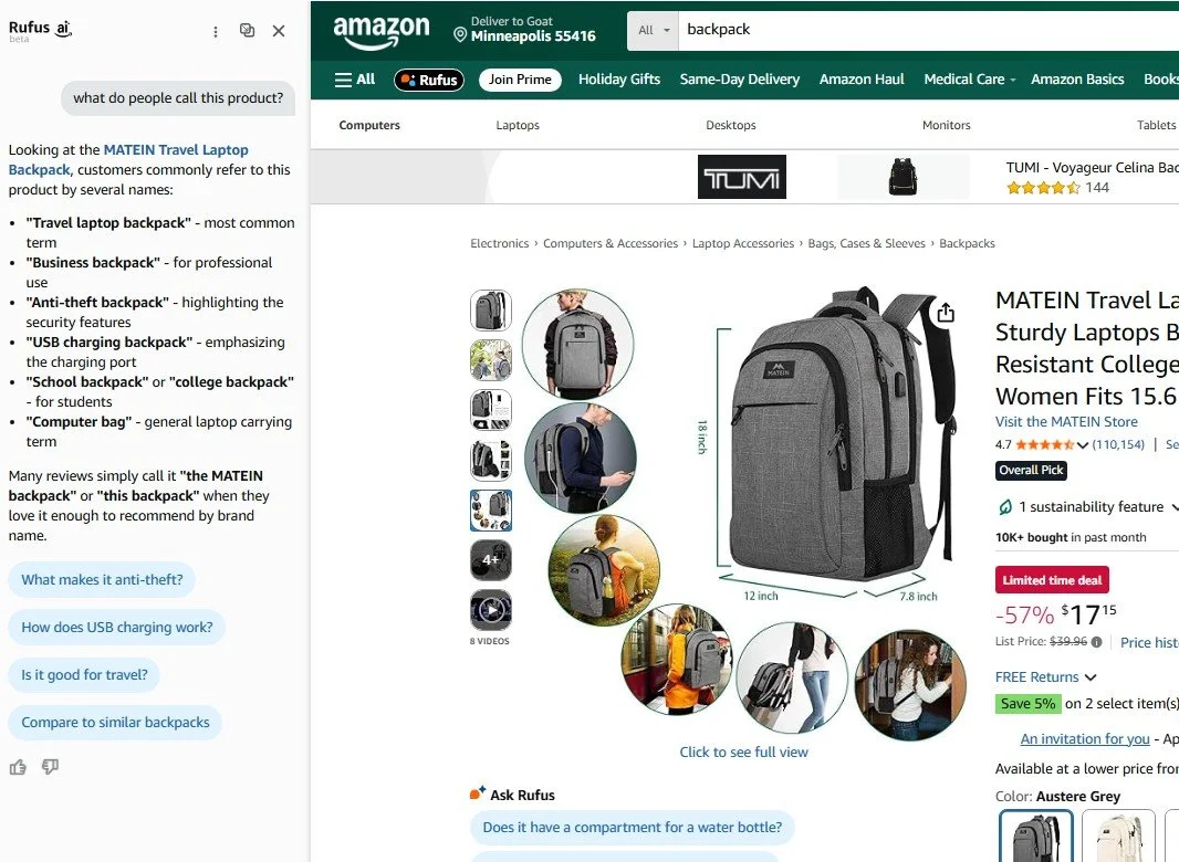 Asking Amazon Rufus “what do people call this product?” on a backpack listing